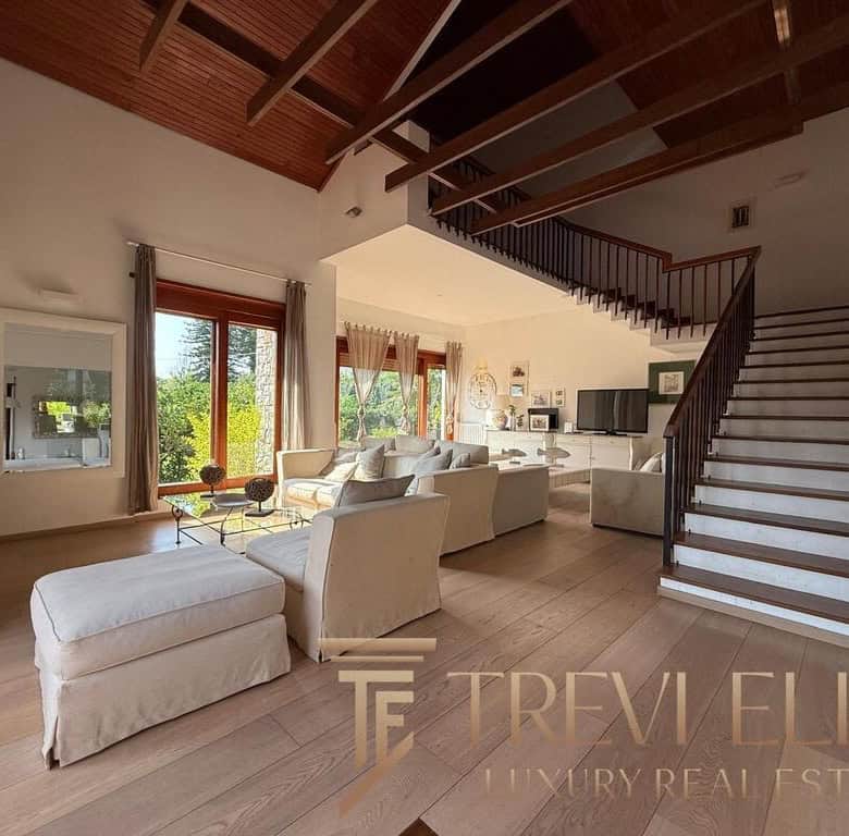 The ground floor opens into a bright and spacious living area featuring an elegant lounge, a dedicated dining space, and a fully equipped kitchen. This level also includes a comfortable guest bathroom and a master bedroom with private en-suite bathroom, ensuring convenience and privacy. Large openings connect the interior with the garden and pool, creating a seamless indoor-outdoor experience typical of refined Mediterranean villas.