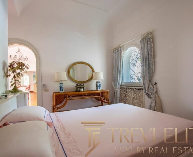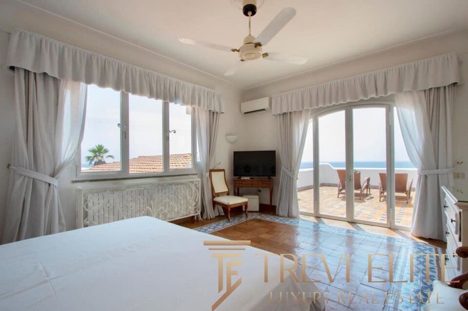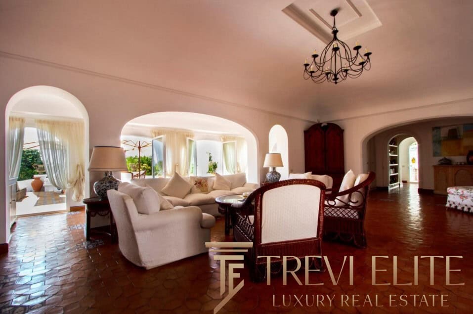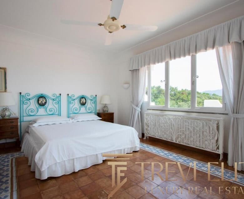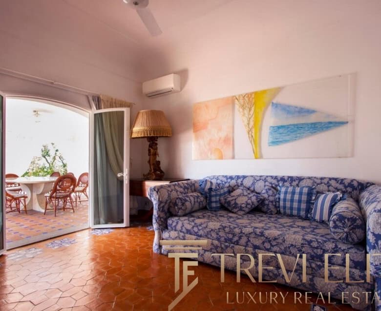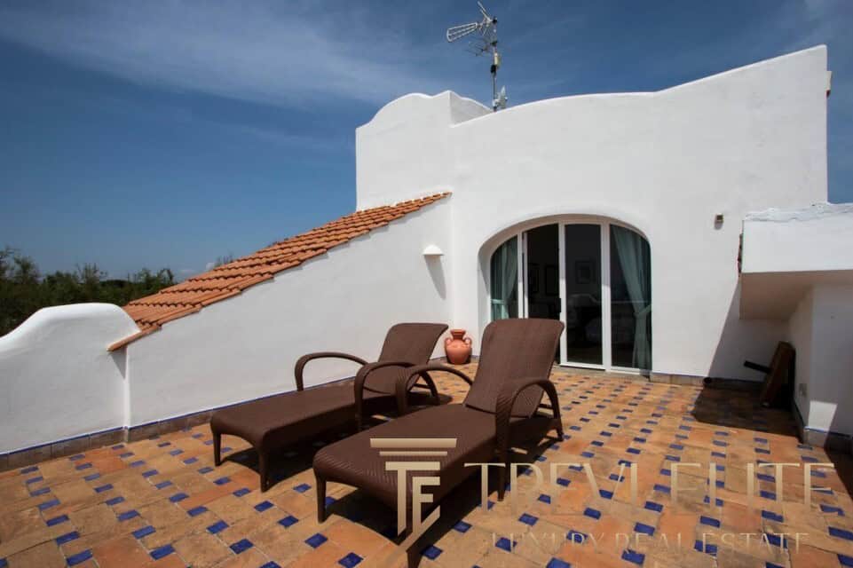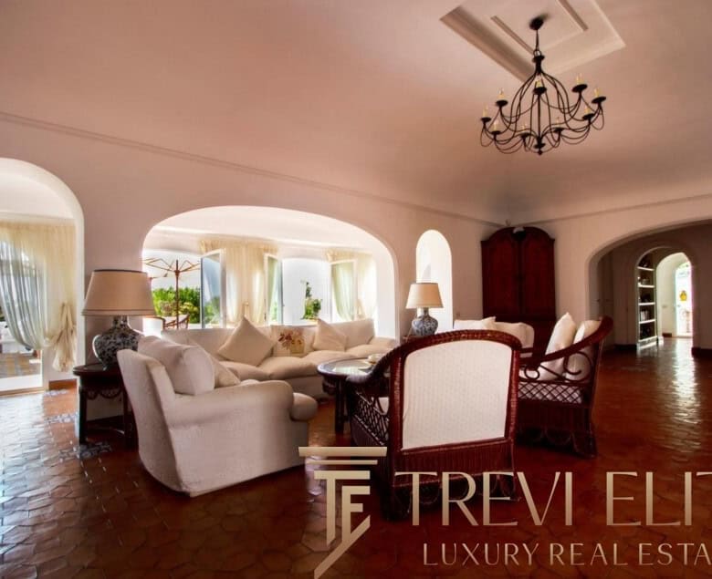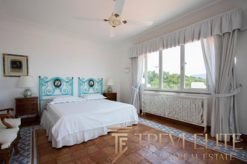 A spacious 130-sqm living room with fireplace and panoramic terraces opens onto breathtaking views of the sea and the Pontine Islands. Four suite-style bedrooms, each with a private bathroom finished with handcrafted Vietri majolica tiles, ensure comfort and privacy for every guest. Air conditioning in all bedrooms guarantees comfort during hot summer days.