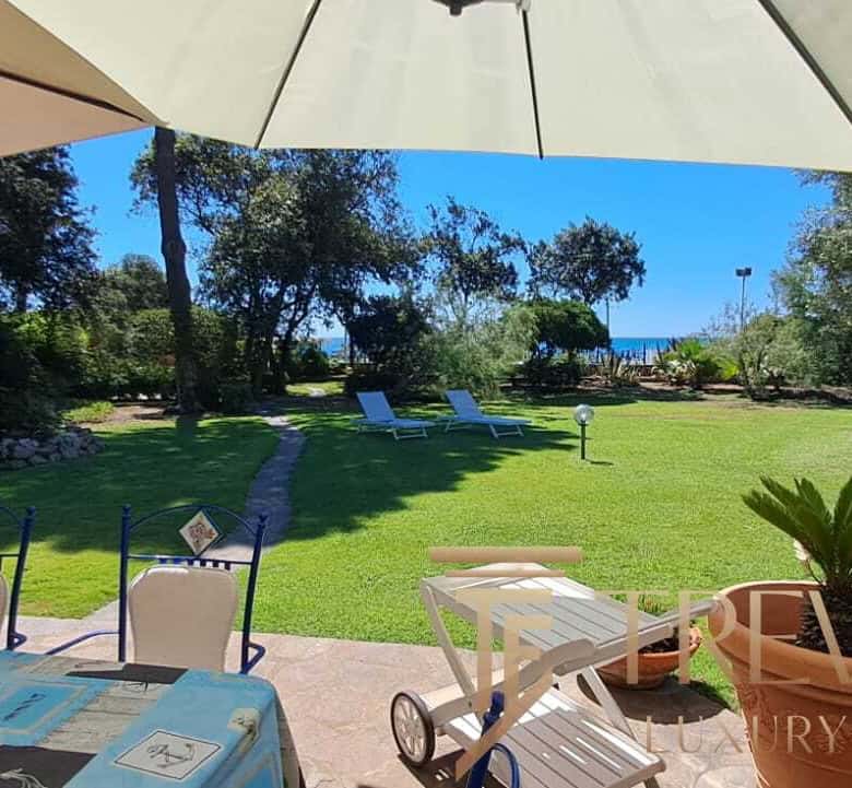 Outdoor spaces define the character of the residence. A beautifully maintained private garden leads directly to the beach, offering privileged and discreet access to the sea. The exterior includes a dedicated barbecue area ideal for outdoor dining and social gatherings in complete privacy. Mediterranean vegetation, coastal air, and secure surroundings create a unique balance between comfort and nature. The private beach, tennis courts, and gated residential environment enhance the lifestyle value, making this property an exceptional seaside retreat in San Felice Circeo.