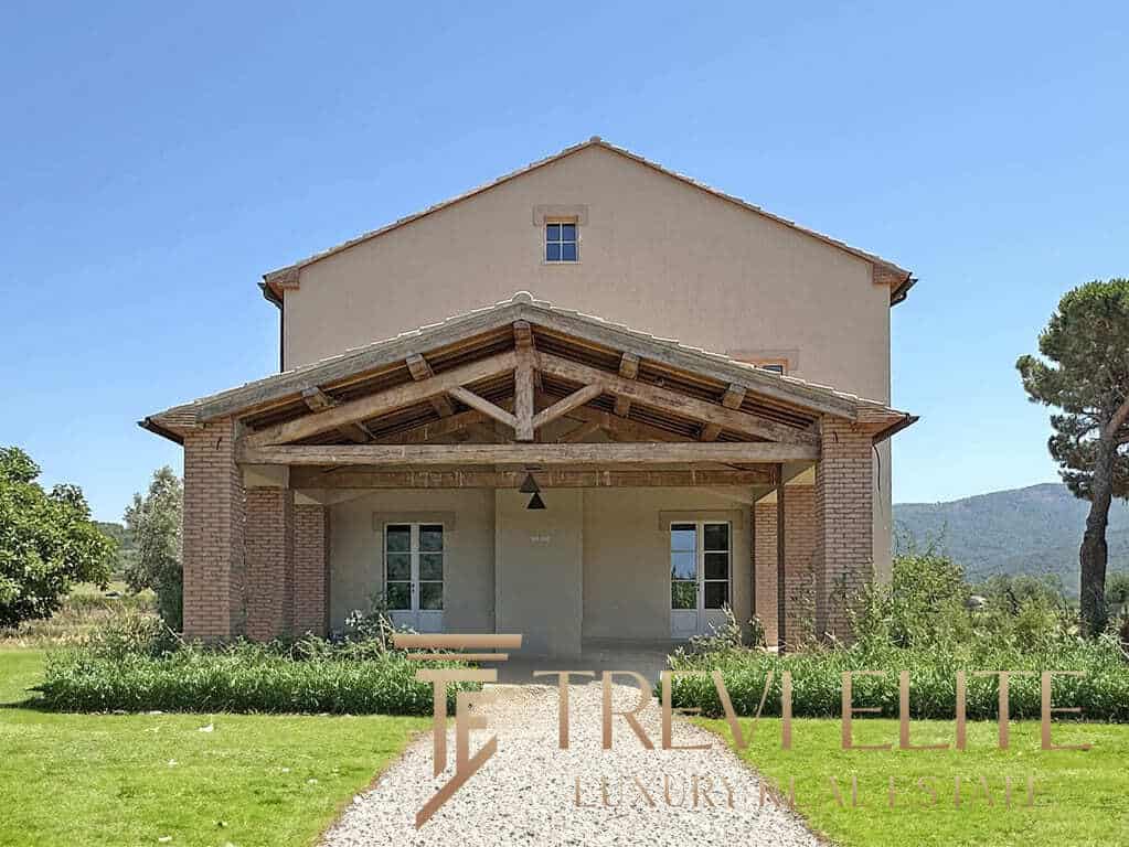 The main agriturismo building — approximately 472 sq m across two floors — was comprehensively restored between 2023 and 2025 and has never been occupied since completion, offering a turn-key hospitality asset in pristine condition. The exterior presents the timeless character of Tuscan rural architecture: pale rendered walls, terracotta roof tiles, stone-framed casement windows and a generous side portico with exposed timber beams and brick pillars, opening onto a broad lawn ideal for al fresco dining and social gatherings. Internally, the ground floor is arranged for the convivial demands of high-end agriturismo: two sitting rooms (one with a fireplace), a professional kitchen, a bright dining room with direct portico access, laundry facilities, staff changing rooms and a guest cloakroom. On the same level, a master suite offers an antechamber, walk-in wardrobe and private bathroom.