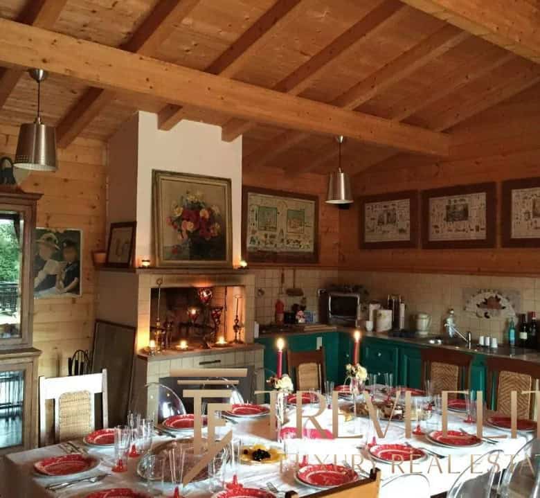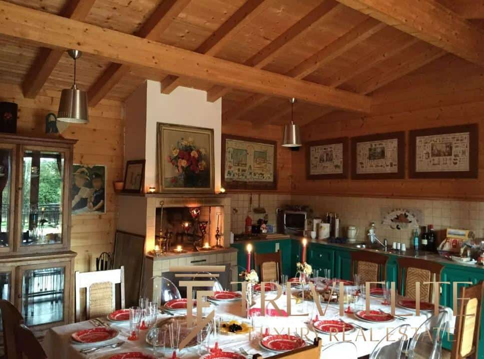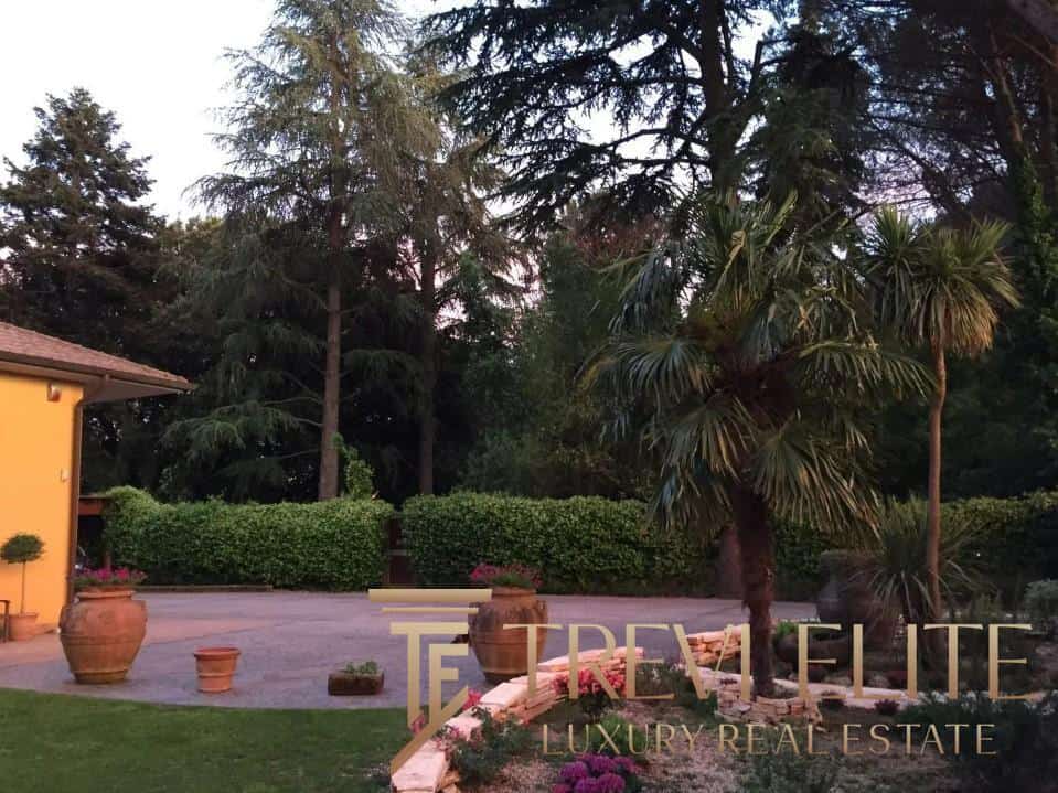 The massive 16,000-square-meter private park with century-old trees creates a secluded oasis atmosphere. Access to the property is through a wide tree-lined driveway with automatic gates. The grounds include a separate 75-square-meter wooden guest house with its own fireplace and bathroom.