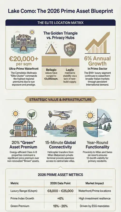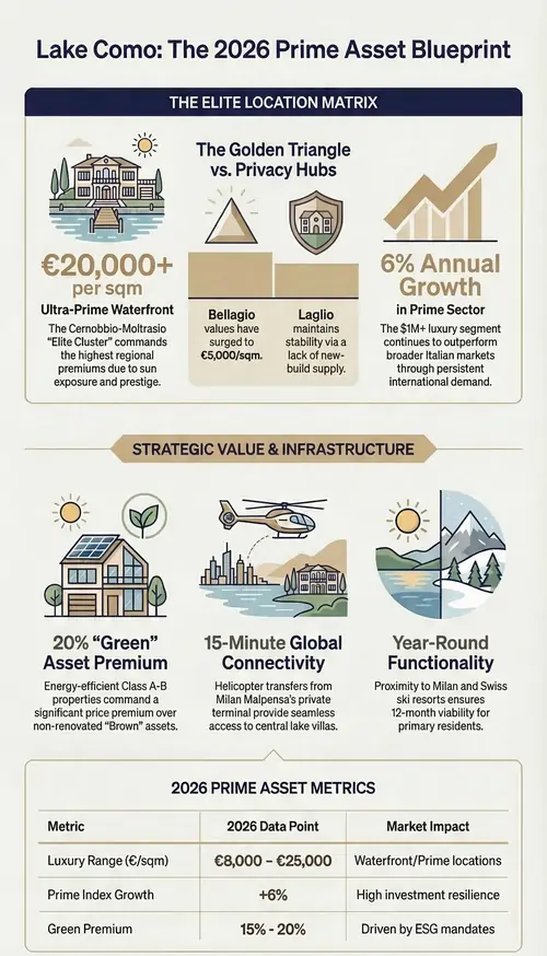 The Lake Como prime real estate market, particularly within the €1M+ sector, is characterized by its robust stability and persistent “flight to quality.” As of 2026, the region continues to solidify its position as an irreplaceable asset, with an average value increase exceeding 6% in 2024-2025. Luxury properties, especially those with coveted waterfront access, command prices ranging from €8,000 to €25,000 per square meter, with ultra-prime estates often surpassing this. While the broader market median is around €360,000, the true investment value lies in the limited supply of villas and high-end apartments. According to recent data, specific prime regions within Lake Como have seen growth as high as 19.9%. The market exhibits a clear “Green Premium,” where energy-efficient assets command a 15-20% higher value, aligning with modern ESG mandates and offering long-term capital protection.
